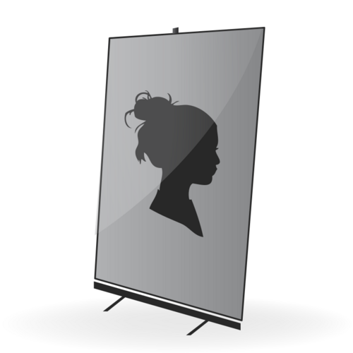 Das Motiv aus der Kassette ziehen, das Rollbanner dabei nach hinten senken und das Motiv in den Aufsatz einklinken.